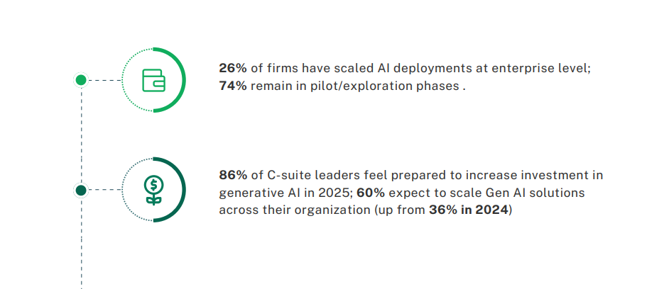- Only 26% of firms have scaled AI deployments; 74% remain in pilot/exploration phases.