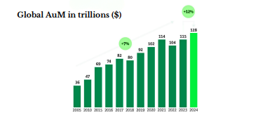 - Global AuM reaches new heights: Assets under management hit a record $128 trillion in 2024, up 12% year on-year, marking a robust rebound from 2022’s downturn